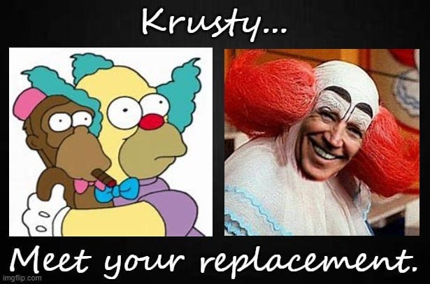Finally... there's Krusty the Clown; he's a Jew. So, to avoid any possibility of an anti-Palestinian controversy, Sir Herschel Shmoikel Pinchas Yerucham Krustofsky has to go, too. Fortunately, the perfect replacement clown stands ready to join the cast.